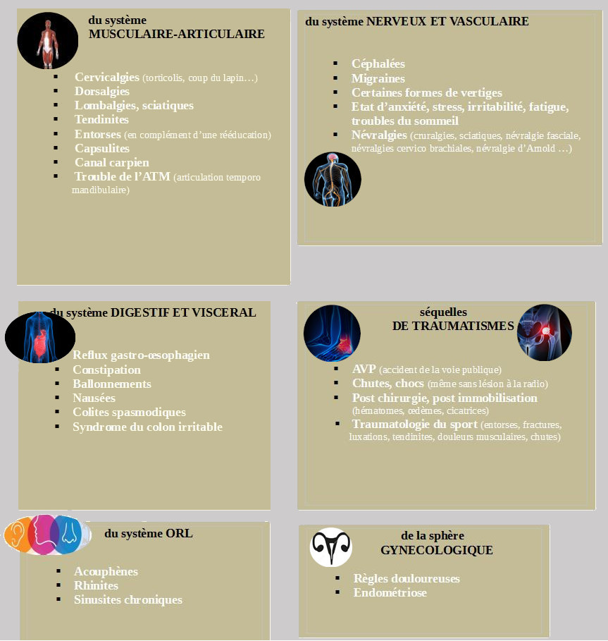 La fasciathérapie permet d’aborder une multitude de symptômes :