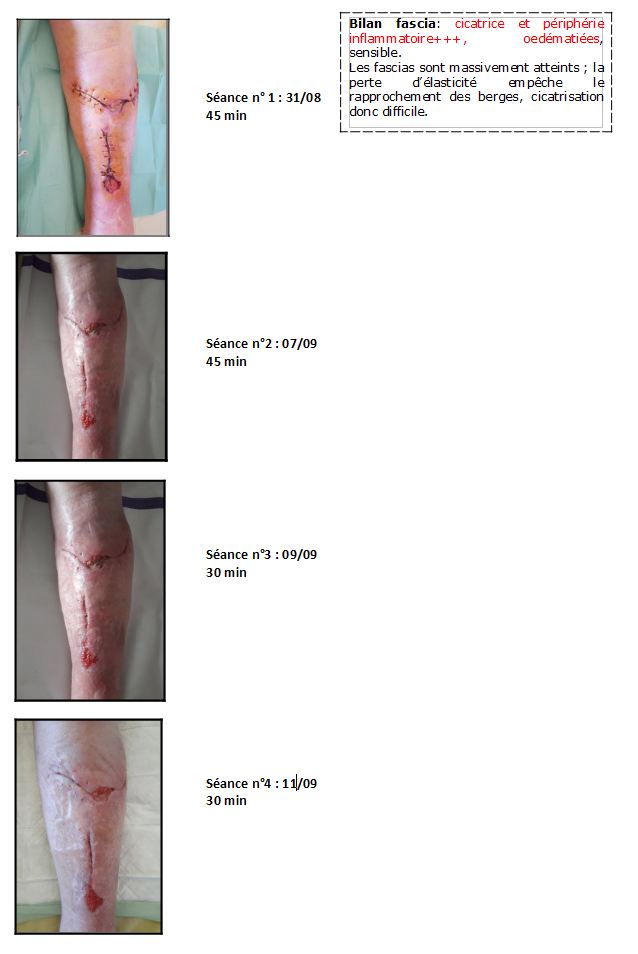 - Chute mécanique (sans fracture) en montant dans le bus. Plaies délabrantes du membre inférieur gauche, parage chirurgical. Complication (traitée par pyostacine en post op), retard de cicatrisation. Fasciathérapie débutée 6 jours après le traitement.