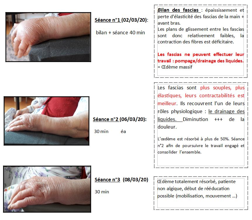- Chute avec fracture du poignet gauche (type Pouteau colles), opérée par brochage, immobilisation par attelle. Œdème massif au retrait de l’attelle, patiente algique+++, mobilisation articulaire très limitée, fonctionnalité de la main très précaire.